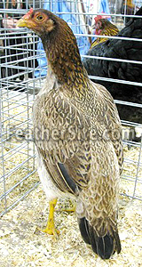 What do Asils look like and where are they from? Well, Asils are the ancestors of the Cornish breed, so they look sort of like a more slender, athletic Cornish. The Asil developed in India as a fighting bird, but different than the English games--an Asil is like a boxer (versus a fencer) and is valued for stamina. They are heavy boned, heavy muscled, very hard feathered birds (bare breastbone), with somewhat of an upright carriage. The eyes are a sort of pearl white with a greenish tint and a heavy brow ridge (like a hawk). Both sexes have a small pea comb, but no wattles, and the sloping tail tends to fan horizontally rather than vertically. Hens are poor layers, but very tenacious setters, and will brood for months on end (I usually use Asils to hatch most of my babies as they are the most reliable). Asils are usually very tame and easy to handle, and one of mine ("Ana") is a particular pet that likes to follow me around looking for handouts.
