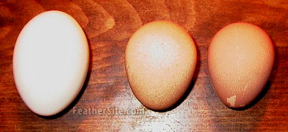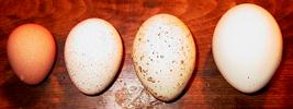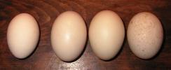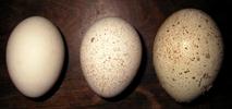 From left to right: guinea egg, 2 turkey eggs, peafowl egg