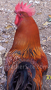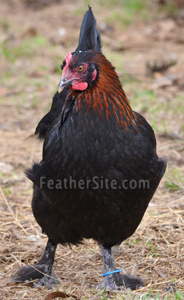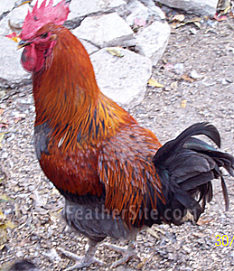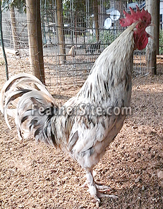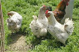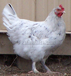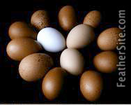 This breed, which originated in western France in the town of Marans, is best known for its dark chocolate colored eggs. It is a fast grower and does well in damp areas, having been developed in a marshy portion of France. The original French birds have feathered legs, but this characteristic has been bred out of the British and many American lines. The French recognize 8 varieties: 1. Silver Cuckoo, 2. Golden Cuckoo, 3. White, 4. Coppered Black, 5. Black, 6. Wheat, 7. Black-tailed Fawn, and 8. Ermine; they are considering adding the Silvered Black (created since 1932 and remarkable for the color and spherical form of its eggs). In the Cuckoo Marans, males are lighter in color than females--it is said to be possible to color sex them even as chicks with pretty good accuracy. I've never seen or heard about the other varieties.